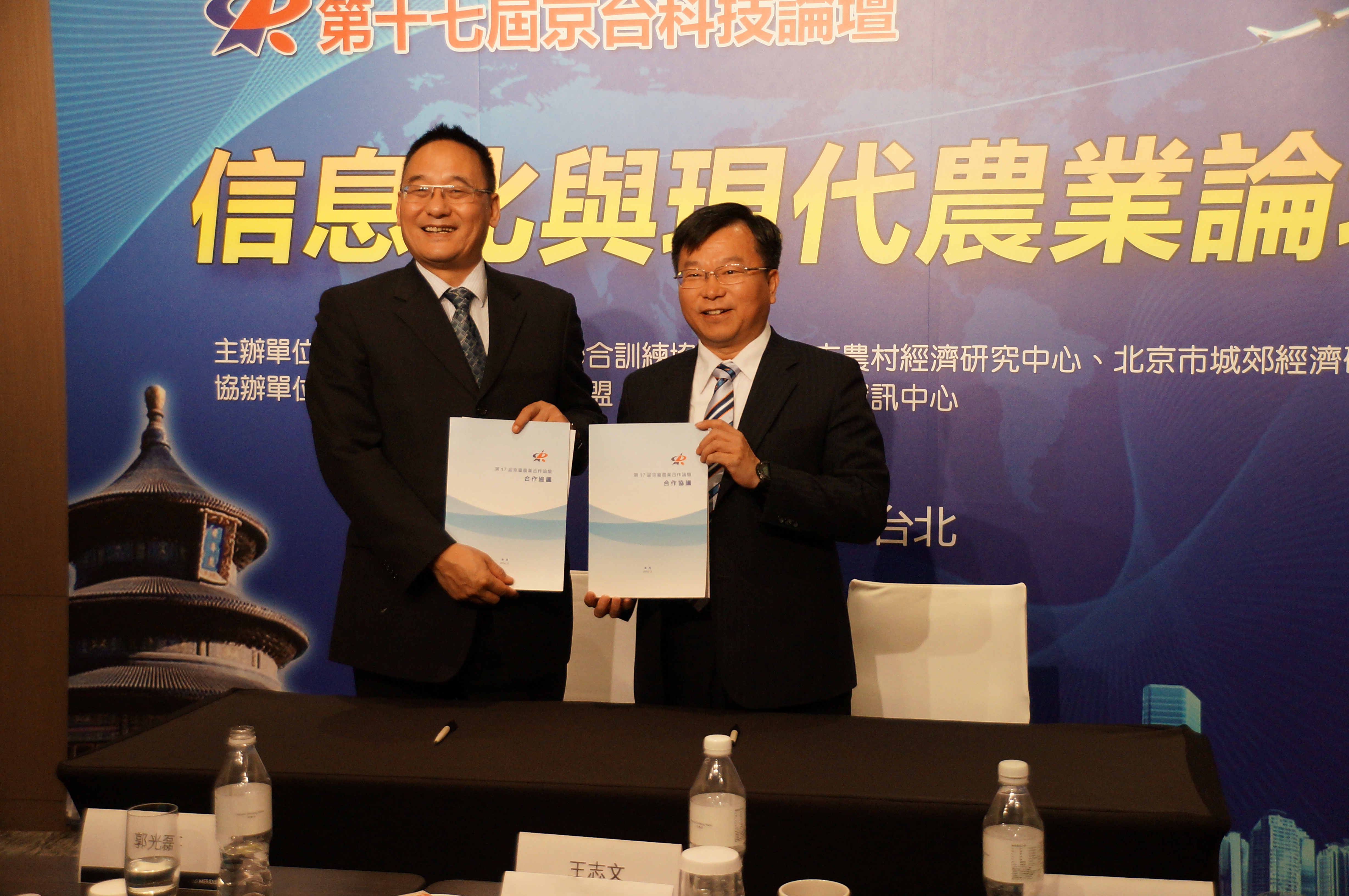 2014年12月17日,北京市农村经济研究中心主任、北京市城郊经济研究会会长郭光磊同志带领由北京市农研中心、北京城乡经济信息中心、北京市规划研究院、北京市国土局、北京顺鑫农业集团有限公司、北京奥科美技术服务有限公司等相关单位专家,农民专业合作社及乡镇代表组成的京台农业合作论坛交流团,赴台北参加了第十七届京台科技论坛开幕式和信息化与现代农业论坛。京台双方代表围绕促进信息化在京台两地农业生产、经营、管理和服务等方面的应用进行了深入的交流,取得了丰硕的成果。